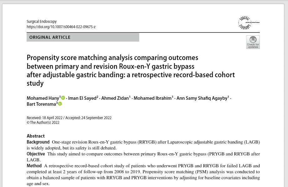 Propensity score matching analysis comparing outcomes between primary and revision Roux-en-Y gastric bypass after adjustable gastric banding: a retrospective record-based cohort study