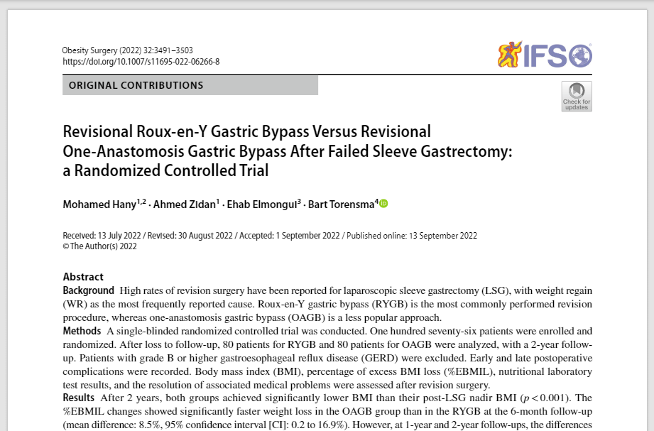 Revisional Roux-en-Y Gastric Bypass Versus Revisional One-Anastomosis Gastric Bypass After Failed Sleeve Gastrectomy: a Randomized Controlled Trial