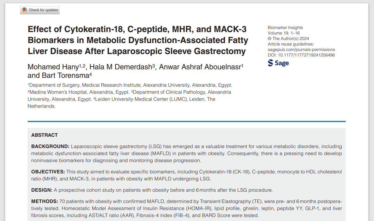 This study aimed to evaluate specific biomarkers, including Cytokeratin-18 (CK-18), C-peptide, monocyte to HDL cholesterol ratio (MHR), and MACK-3, in patients with obesity with MAFLD undergoing LSG. A prospective cohort